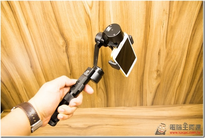《Z1 SMOOTH C》穩定器裝上手機後,手持的模樣,還沒開機時垂頭是很正常的喔: