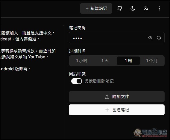 接著就能開始使用,操作介面很簡單,左邊就輸入你要分享的筆記內容,不確定有沒有字數限制,看起來好像沒有。右側則可以設定筆記密碼、過期時間、閱後即焚、以及附加文件: