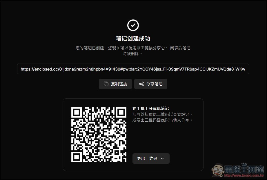 對方打開會跳出這個提示畫面「此筆記已配置為閱後即焚,顯示筆記後,它將被永久刪除且無法恢復」,按「已知曉,顯示筆記」可進行閱讀,但其他人再貼同一個連結,就會找不到這筆記,記得跟對商說筆記視窗要開著,關掉後再打開就會不見: