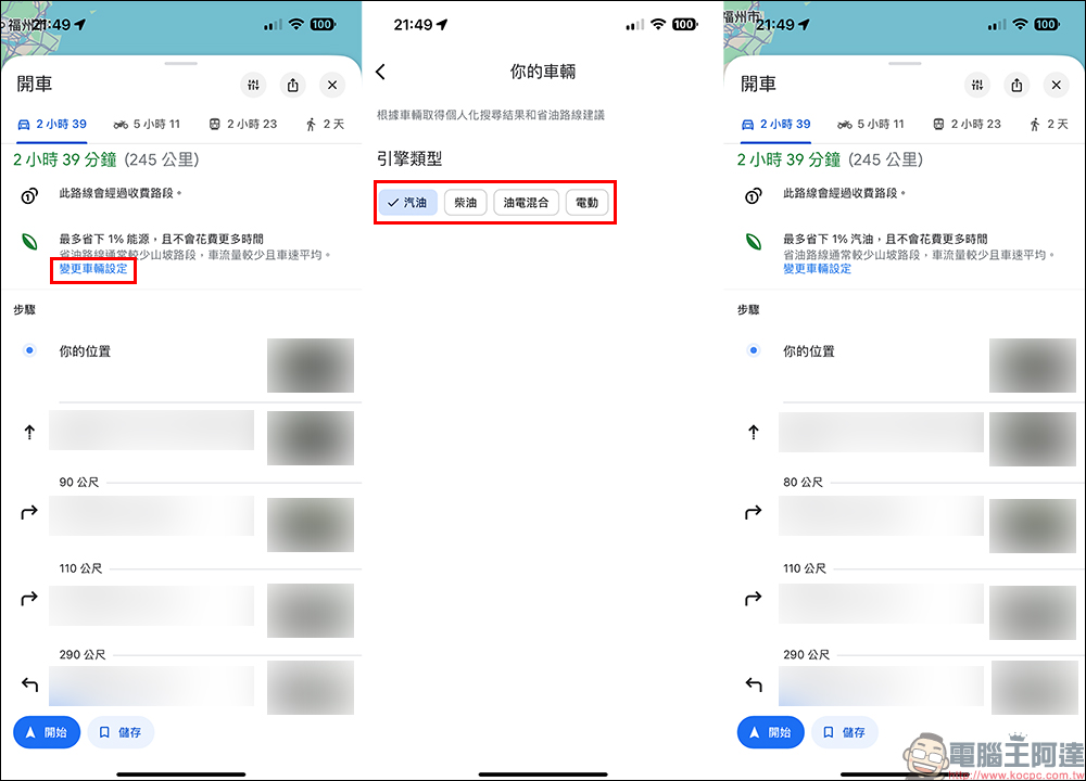 設定完目的地與車輛後,導航會顯示最多省下的能源比率,也能在這裡點選「變更車輛設定」切換不同車輛類型。
