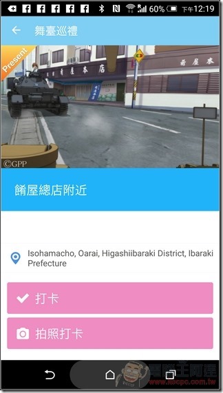 接下來會開啟拍照打卡介面,在左上角有「場景」(與動畫場景對照)和「AR」兩種選擇,執行 AR 後會有「少女與戰車」的角色出現與現地拍照: