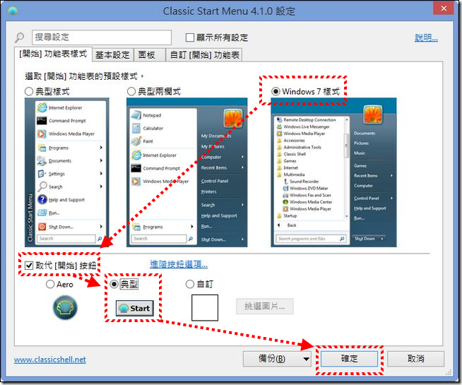 但安裝「Classic Shell」之後就算您按下鍵盤的「視窗」鍵,原本 Windows8 是回到動態磚,現在則一樣是呼叫出「開始功能表」,如果想回到動態磚介面也沒問題,只要執行最上方的「[開始]畫面」即可: