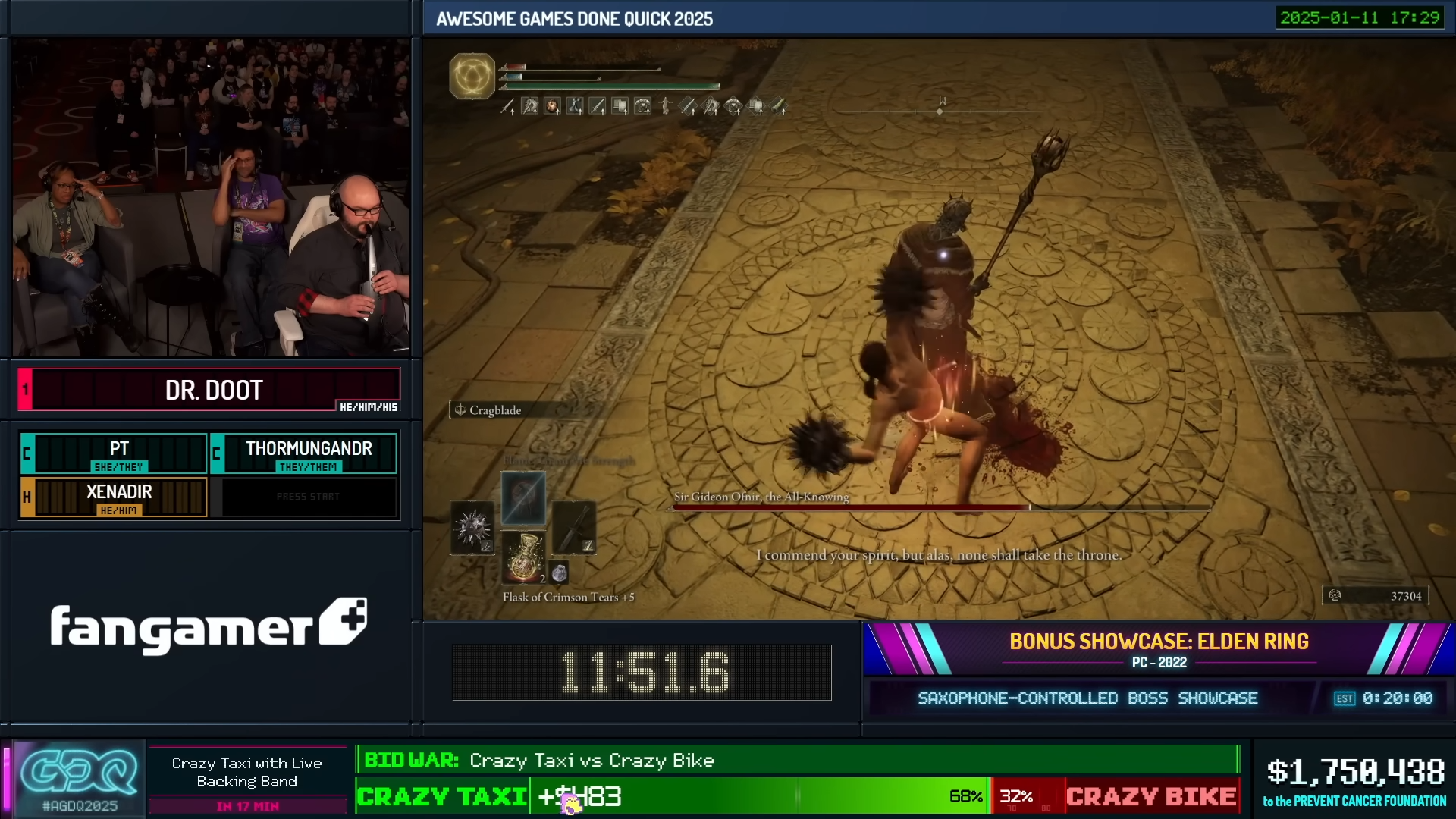 在這次的活動上,Dr. Doot 的挑戰目標是使用預先準備好的存檔來擊敗一系列的 Boss,也就是「Boss Rush」。挑戰包括「拉卡德」、「碎星拉塔恩」、「火焰巨人」、「黑劍瑪利喀斯」、「百智爵士基甸」、「葛孚雷」、「拉達岡」、「艾爾登之獸」,而最後則是整款《艾爾登法環》遊戲本體中公認的最強 Boss「瑪連妮亞」,有點好笑的是,這個電子薩克斯風是真的能夠發出聲音的,所以挑戰過程中會不斷聽到各種「嘟嘟」聲。除此之外,實況活動主持人 Xenadir 還為 Dr. Doot 設下一個新規則,只要他能無傷擊敗一隻 Boss,他就捐贈 10 美元,如果他能全程無傷擊敗,他就捐 100 美元。