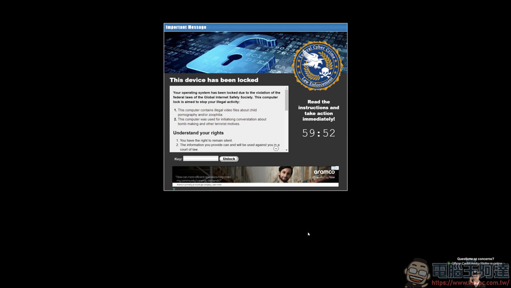 像之前電腦中了勒索病毒之後,就會持續出現要求你付錢的畫面,不付錢就很難取回電腦的控制權。在 Geekprank 上也可以模擬,不過僅只有模擬的功能,並不會真的要求付現,所以怎麼亂按都沒關係XD