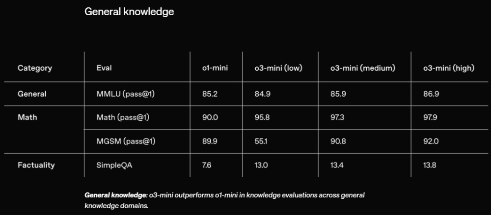 博士級科學問題中,o3-mini-low 就已經超越 o1-mini 約 17.67%,o3-mini-high 更來到 32.83%,同樣超越 o1 模型: