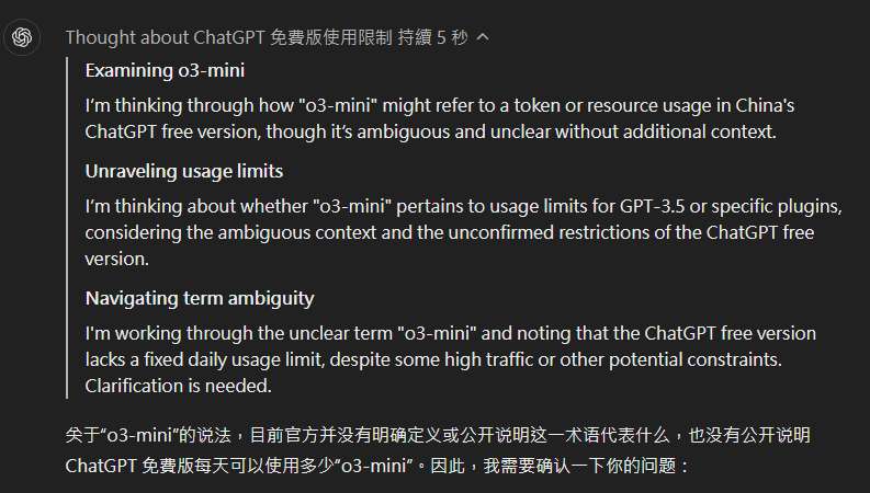 o3-mini 回覆時會跟 DeepSeek 一樣,公開思考過程,有興趣了解的人可以打開來看: