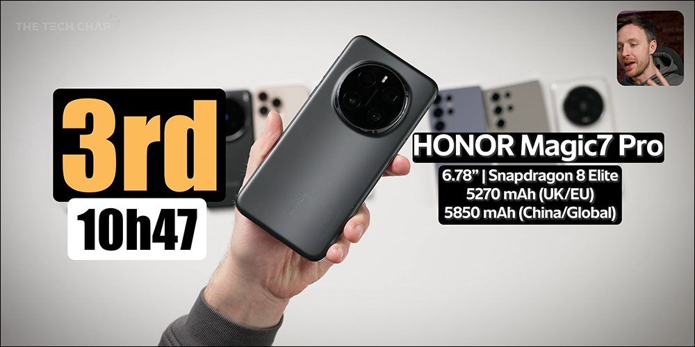 第 3 名是 HONOR Magic7 Pro ,搭載 6.78 吋螢幕、Snapdragon 8 Elite 行動平台,英國與歐洲內建 5270mAh 大容量電池,中國和其他市場內建 5850mAh 大容量電池,測試續航 10 小時 47 分鐘。