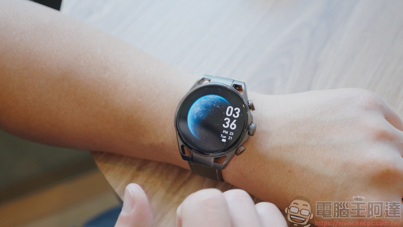 機身右側配置三顆錶冠,第一顆及第三顆皆為按壓控制,第一顆具有喚醒/息屏的功能,第三顆則是鍛鍊。中間的錶冠按壓一下會進入選單 ( 在其他設定選項則為返回功能 ),同時轉盤還可以直接旋轉瀏覽選單,在待機模式下旋轉則可以切換待機畫面 :