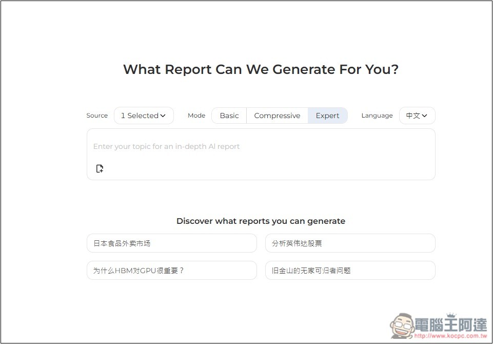Kompas AI 是國外開發的 AI 工具,不過使用的模型支援中文,所以也能輸入中文。操作介面很簡單,進到網站後,就輸入你想要生成的深度研究報告描述,簡短一句話也可以。免註冊即可使用,最多可生成 4 份報告,數量還蠻多的,不過這 4 份是包含轉換成其他格式或修改,這點要注意: