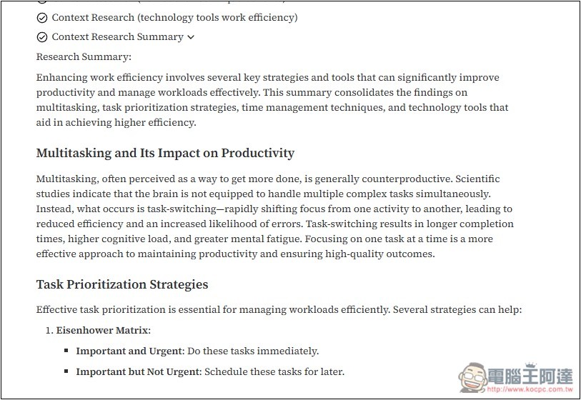 而我只是短短問如何提升工作效率,這款 AI 工具就幫我生成出一篇超完整報告,分成很多部分,像是上圖的多任務處理對生產力的、下圖的各種方法和技術: