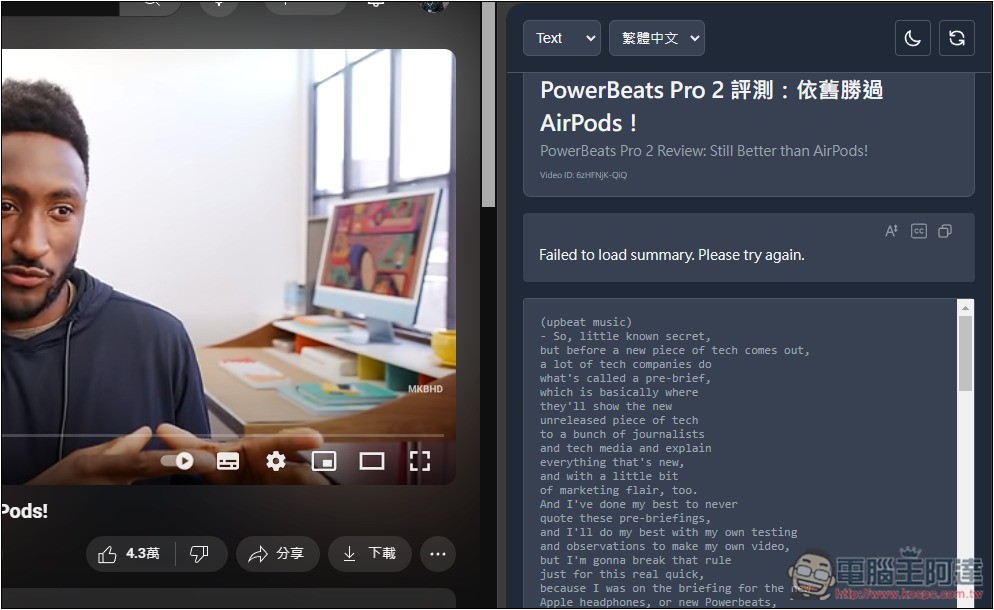 我還有測試國外影片,下圖是 MKBHD 最新的 PowerBeats Pro 2 Review: Still Better than AirPods! 評測影片,即使是英文內容,也會用繁體中文進行摘要,這相當不錯:
