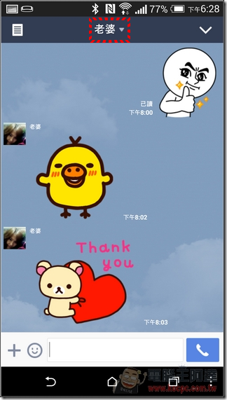首先將 LINE 更新到最新版本後,找一個想要講私密訊息的聯絡人聊天,接著在畫面最上方人名的位置點一下: