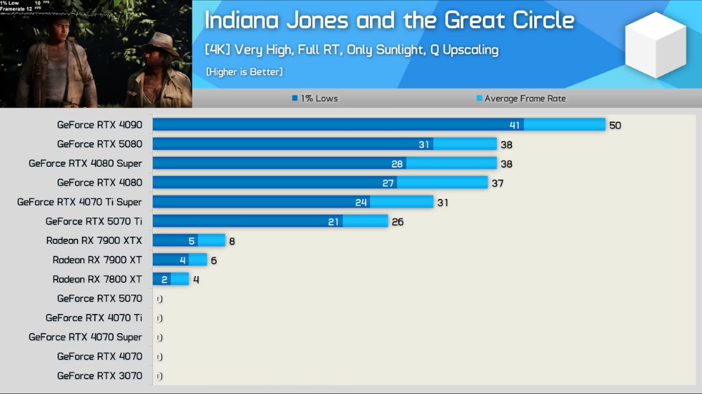 而 Hardware Unboxed 也分享《印第安納瓊斯:古老之圈》的實測結果,RTX 5070 同樣遇到記憶體不足的情況,在 1440p 超高畫質、完整 RT 等設置情況下,RTX 4090 依舊能跑出平均 73 FPS 的順暢表現,RTX 5070 就非常慘,只有 13 FPS,完全跑不到: