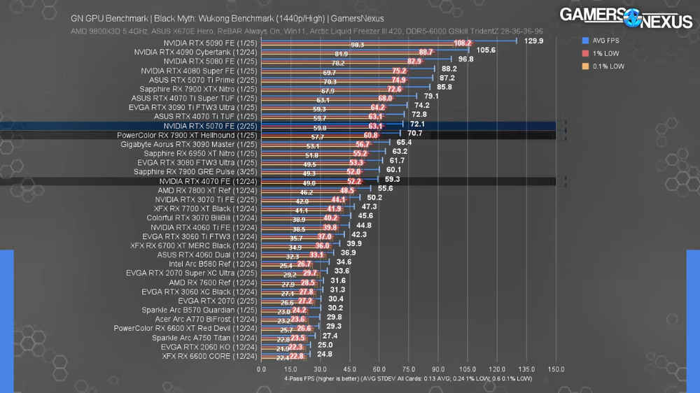 《黑神話:悟空》就比較不同,1440p 的設定中,RTX 5070 FE 獲得平均 70.7FPS,這就略低於 ASUS RTX 4070 Ti TUF 和 Super 型號,但比上一代 RTX 4070 FE 還高: