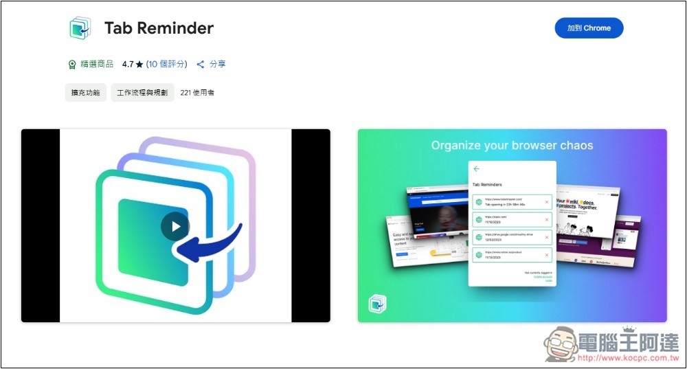 按上方連結進到 Tab Reminder 的 Chrome 擴充商店頁面後,按右上角的加到 “Chrome”: