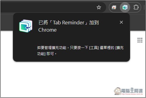 現在的瀏覽器預設都會把新安裝擴充功能飲藏起來,因此需要進到最右側的圖示裡,把 Tab Reminder 釘選起來,才會顯示在右上方: