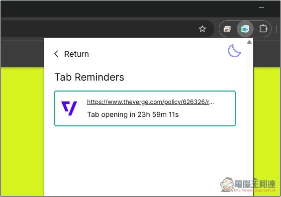 Tab Reminder 是一款 Chrome 擴充功能,基本上只要是 Chromium 核心開發的瀏覽器都能安裝使用,如:Microsoft Edge。雖然只有英文,但操作很簡單。