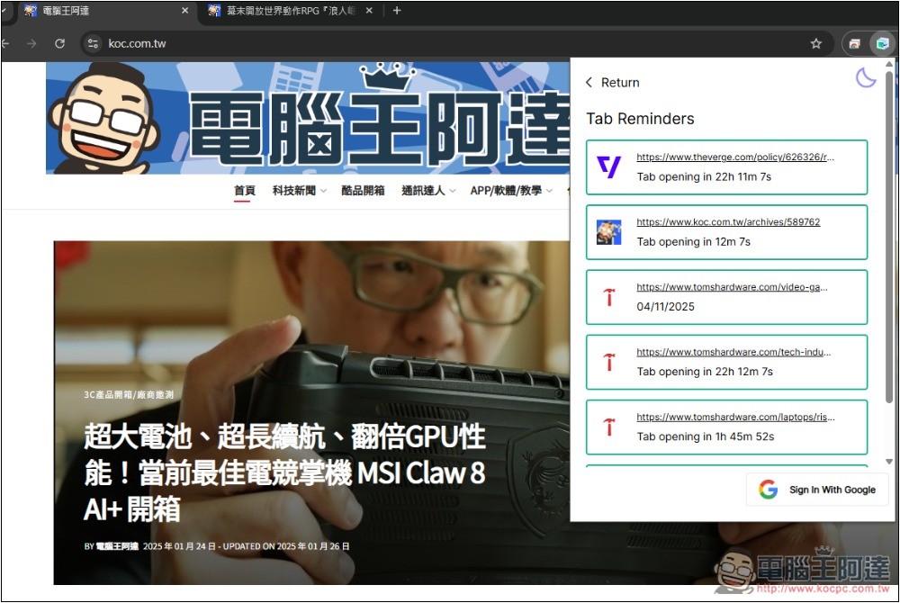 最近就發現到這款 Tab Reminder 擴充功能可以解決這問題,可設定網頁分頁的自動開啟時間,意味著設定好後,就可以把這分頁關掉,等時間到會自動開啟在新分頁中。