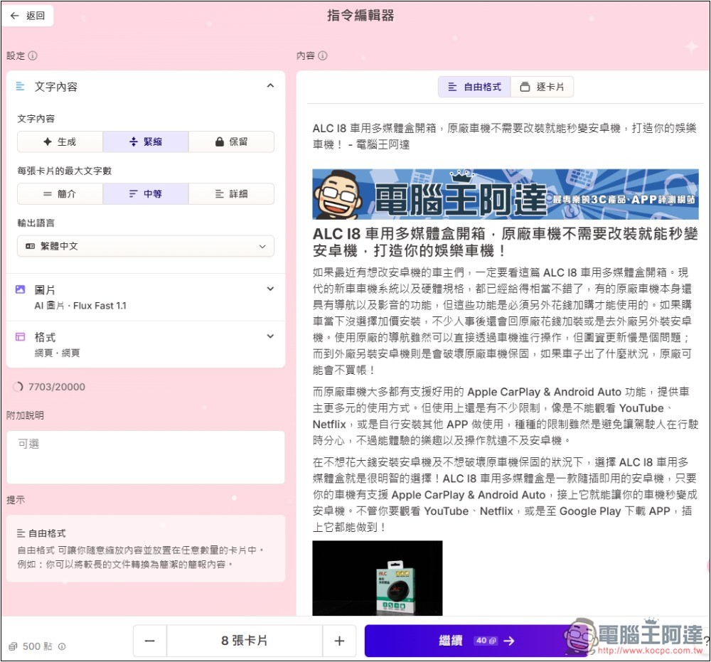 會進入編輯器,如果你跟我一樣,匯入內容超出免費版限制的 20000,可以將一些不要的內容給刪除,沒超出的話,懶得修改可以直接生成,基本上生成出的展示網頁,不會有無關緊要的內容。左邊還能設置文字內容選項,像是每張卡片的最大文字數、輸出語言、圖片: