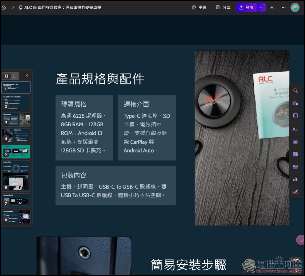 像這樣,展示內容的網頁就製作完成了,你可以將專屬網址分享給對方,這是我這篇示範的ALC I8 車用多媒體盒展示網址: