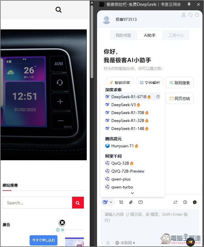 此外,極客側邊欄主要有三大功能,分別是跨平台雲端同步、AI 書籤、以及 AI 助手,而這篇要介紹的 DeepSeek R1 671B 是在 AI 助手中提供,意味著它有非常多功能,取得後可以多試試。