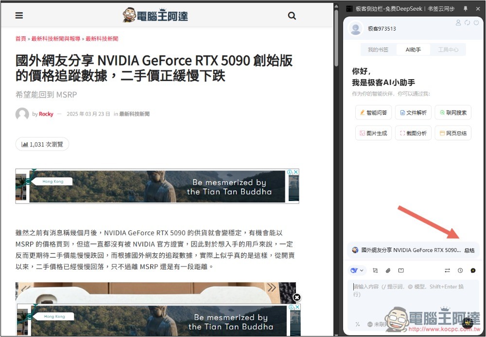 這 AI 助手有一個很棒的地方在,它會自動擷取你目前正在閱讀的網頁,如果你是想獲得總結,只需要按一下 AI 助手中的總結: