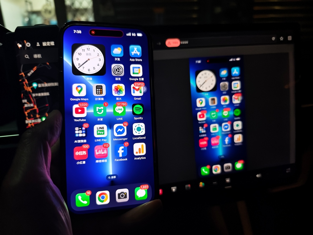 TV Mirror for Chromecast 實際連接特斯拉車機的畫面,這樣就能用車機投影 iPhone畫面了,不過要注意的是只要開車瀏覽器就會自動關閉,並不能邊開邊看(也不安全):