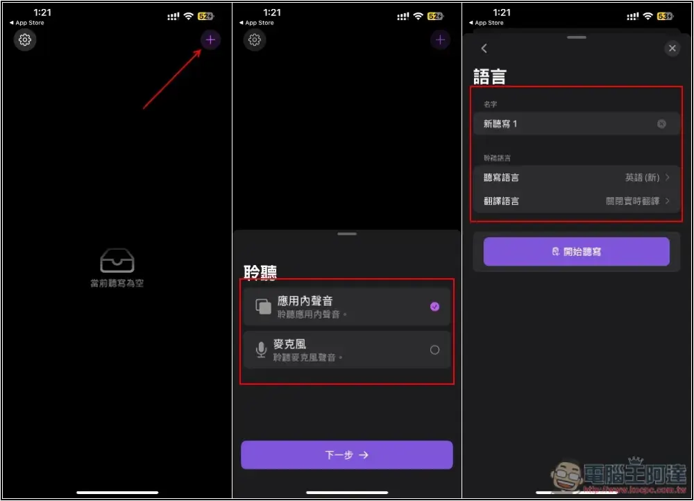 操作介面很簡單,打開 App 後,按右上方的 + 來添加新任務,選擇錄製聆聽的方式,Podcast 等 App 就選「應用內聲音」,也支援麥克風。接著會進到聆聽語言的設置畫面,可以先設定好任務名字,確認聽寫語言對不對,如果你不需要翻譯,只要即時語音轉字幕的話,那翻譯語言可關閉,想即時翻譯,請按翻譯語言: