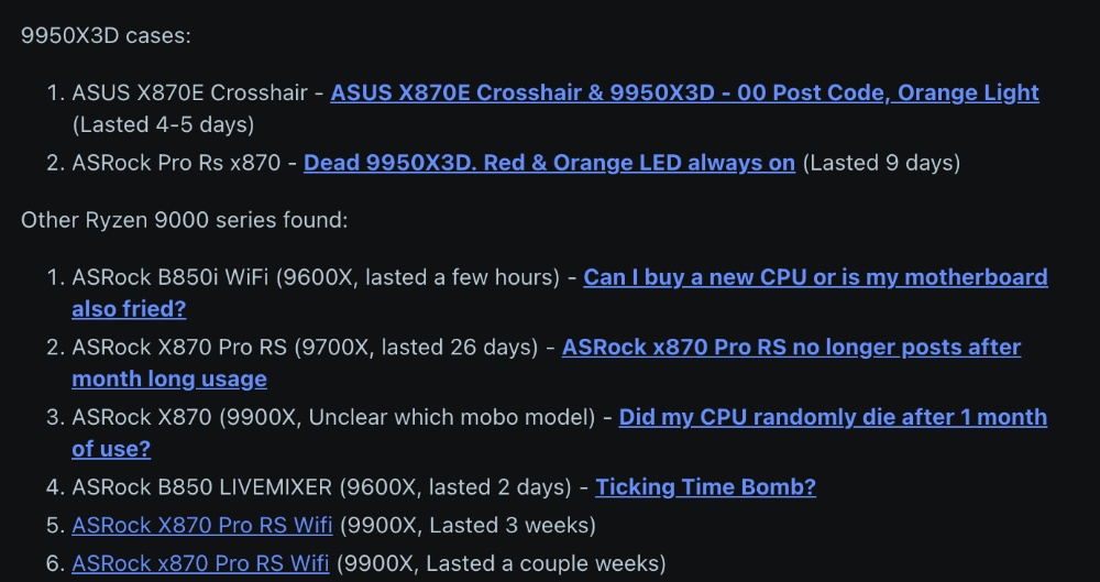 至於其他 X3D 系列,也是有零星的 Ryzen 9 9950X3D 發生故障個案,清單上也能找到,還有其他 Ryzen 9000 系列: