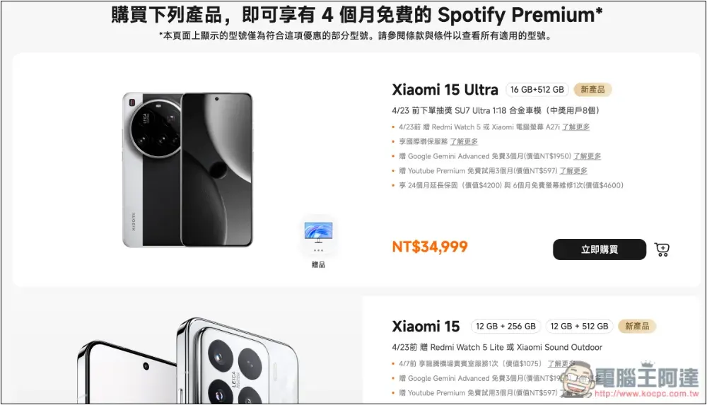首先是最新小米手機系列,可兌換 4 個月的 Spotify Premium,符合的有 Xiaomi 15 Ultra、Xiaomi 15、Xiaomi 14T Pro、Xiaomi 14T、Xiaomi MIX Flip、Xiaomi 14 Ultra: