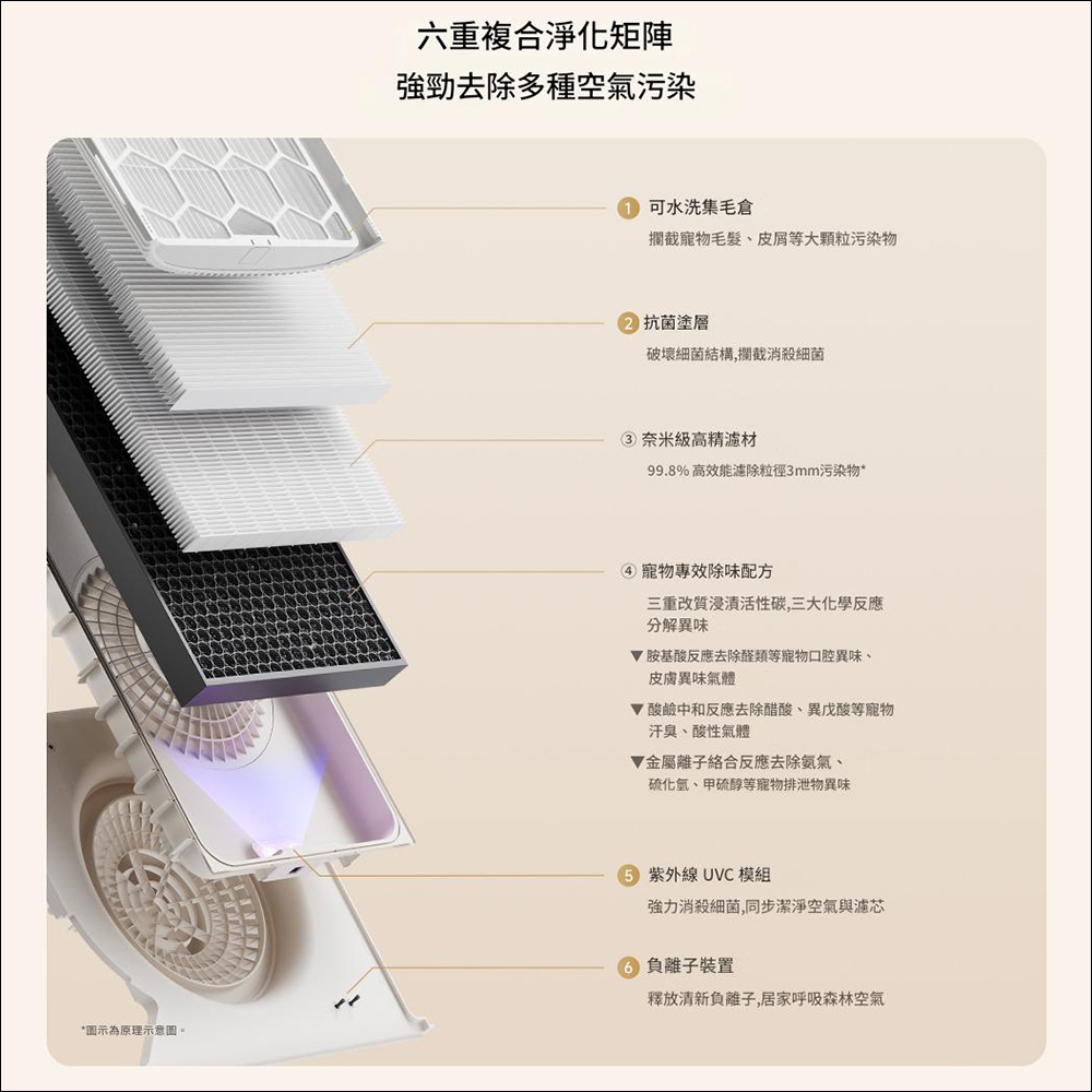 濾網部分則採用了六重過濾結構,當中包含專門針對寵物氣味優化的活性碳配方,可有效吸附貓砂味、狗狗口水味、排泄物氣味等常見異味。此外,機身內還配置了紫外線 UVC 抑菌裝置、負離子淨化模組,以及具抗菌塗層的濾網,進一步防止細菌、霉菌等微生物滋生,讓家中的空氣不只是無塵,更能兼顧健康。