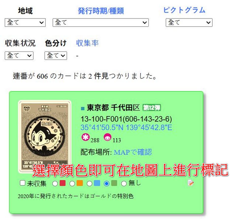 如果大家覺得從地圖這樣看造型人孔蓋不清楚的話,大家也可以點擊「這裡」,前往 manhole card map 為大家整理的從第一彈到第 24 彈的所有造型人孔蓋資訊。大家可以在這裡看感興趣的圖案,點擊該圖案後再跳轉到地圖去尋找人孔蓋喔。