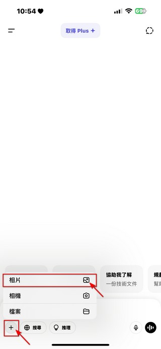 首先先把要加入聯絡人的名片們拍照拍起來,拍起來之後打開 ChatGPT,點擊「+」上傳名片相片。