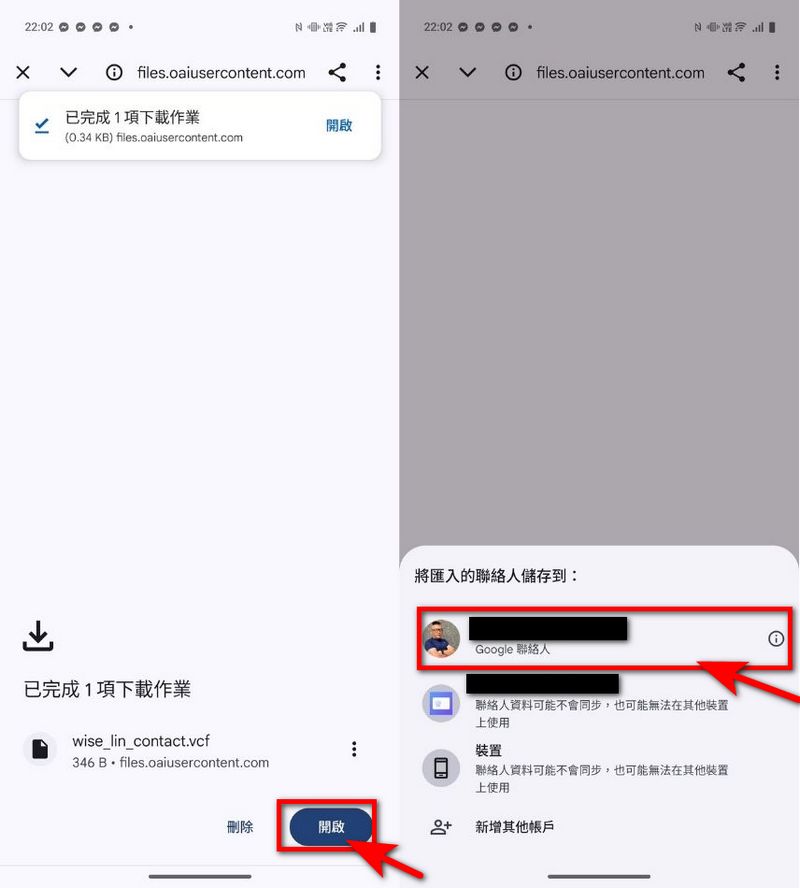Android 用戶在下載 .vcf 檔案的步驟會不太一樣,Android 用戶點擊下載會需要自行開啟檔案,開啟後需要將匯入的聯絡人儲存到 Google 聯絡人。接著應該就會跑到你的手機聯絡人中,有些朋友的手機可能儲存後系統會顯示錯誤,不用擔心,只是顯示錯誤而已資料還是一樣會匯入喔!