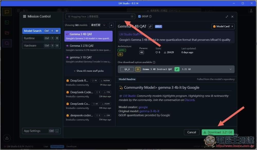 我用的是 Gemma 3 12B,RTX 3080 10GB 顯卡跑起來沒問題,這模型的翻譯品質我覺得還不錯。下載好後按 Use In New Chat: