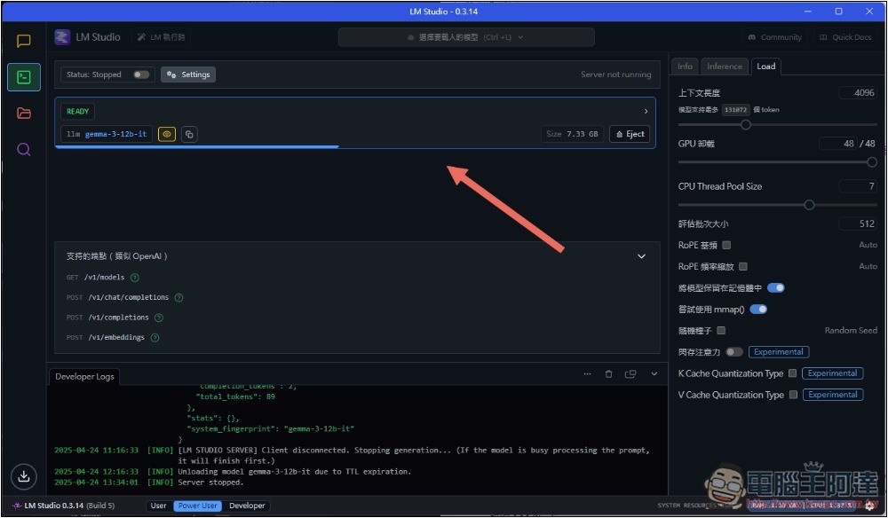 接著按左側第二個功能圖示,這是啟用本地 API 服務的功能,然後按上方模型選擇器: