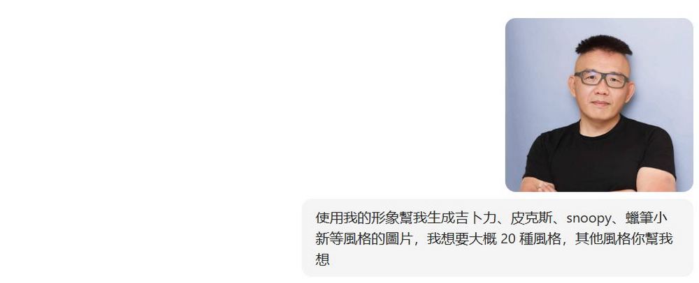 - 「使用我的形象幫我生成吉卜力、皮克斯、snoopy、蠟筆小新等風格的圖片,我想要大概 20 種風格,其他風格你幫我想」