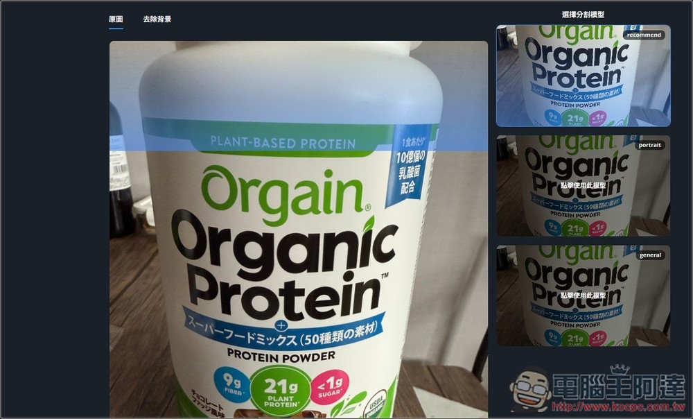 我先測試簡單背景的圖片,這是阿達的人像照,只有純色背景,上傳後 AI 就會開始辨識主題並開始去背,右邊有三種模式,recommend(推薦)、portrait(人像)、general(普通),預設會使用推薦來去背: