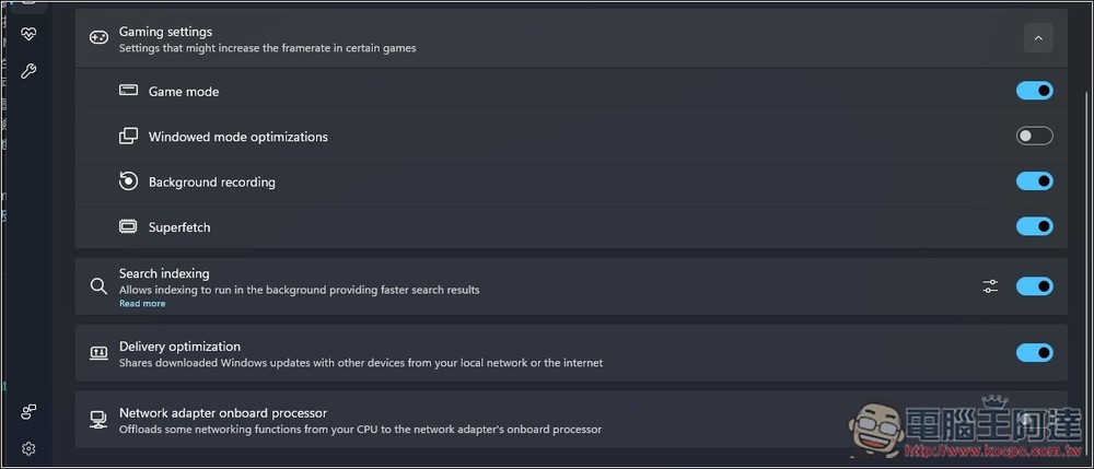 下方還有遊戲設定,可從這邊快速打開「遊戲模式」,以及要不要啟用「視窗模式最佳化」,如果你都是用視窗模式來玩遊戲,很推薦打開,能有效降低延遲: