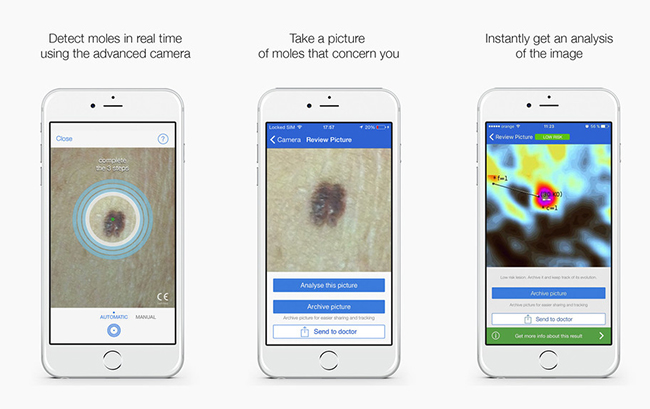 SkinVisio 內建強大的資料庫與演算,當使用者自拍完後即可偵測出目前膚質狀況,不過自拍方式有點不同,不是對著你的臉來自拍,而是對著身上任何有痣的地方進行拍照。App 會依據痣細微的黑色沉澱物,以及周圍膚質進行演算,進而判定是否有機會產生病變的可能性,其精準度可達 83%。