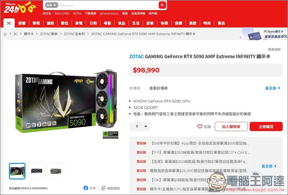 還有 PChome 24 小時購物,也能單買直接買到 ZOTACGAMING GeForce RTX 5090 AMP Extreme INFINITY 顯示卡: