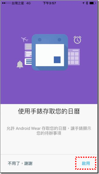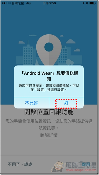 首先您必須要先到 App Store 搜尋「Android Wear」並安裝,接著執行 Android Wear 開始準備配對(請注意,如果您手上的 Android 手錶曾經與其他手機配對過就必須先恢復出廠值),接著 App 會要求取用權限,請同意: