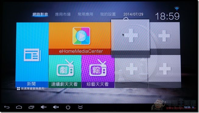 在一開始的設定無線網路與電視顯示區域後,就可以看到直播盒子的主要介面,分別為「網路影音」、「應用市場」、「常用應用」與「我的配置」等選項。而主畫面的第一頁「網路影音」則是包含了「新聞」、「eHomeMediaCenter」、「連續劇天天看」與「綜藝天天看」等選項: