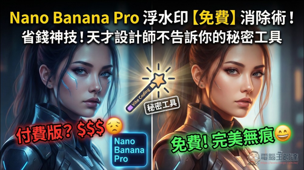 自從 Nano Banana Pro 推出以來,相信大部分喜歡用 AI 創作圖片的朋友應該大都測試過了,它強大的製圖能力、人物一致性與中文字正確度也讓它一口氣成為目前遠超 ChatGPT 的 AI 圖片製作神器,不過如果你沒有買 AI Pro 的話,Gemini 3 Pro 免費仔每天能做的數量有限,而且就算有買會員作圖也是有浮水印,想不要有浮水印就要用付費的 API KEY 在第三方或 AI Studio 製作,一張要4~7元。想要沒有浮水印的話,如果量大的確要花不少錢。阿達自己用 Vibe Coding 了一個去除 Nano Banana Pro 圖片浮水印簡單應用,功能很簡單就是幫你去掉圖片右下角的浮水印,讓你不需要再裁切。