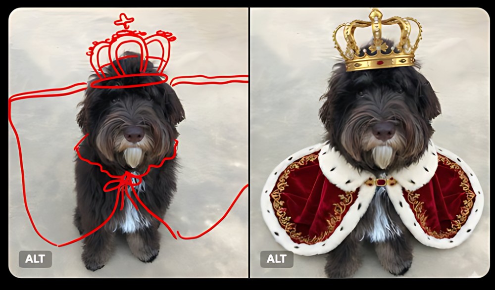 稍早 Google 在 X 官方社群平台上宣布推出新的「塗鴉編輯(Edit images with doodle)」功能,如同官方分享的前後圖片展示,一開始小狗是沒有穿任何衣服的,透過塗鴉功能畫出想要的形狀後,給予提示詞,Gemini 就生成出小狗穿上衣服和戴皇冠圖片。其背後技術當然是基於強大的 Nano Banana 模型: