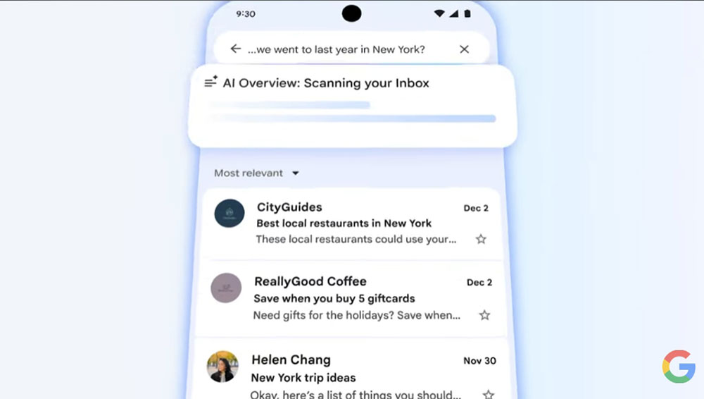 Google 搜尋中的 AI 摘要功能現在已經移植到 Gmail 中。當用戶開啟長郵件串時,AI 摘要會將整條郵件串整合成重點概覽。此外,當使用者在收件匣中進行自然語言搜尋時,不會以電子郵件列表作為搜尋結果,而是會有簡單的 AI 概覽回答。例如,使用者可以問「我去年在紐約住的飯店是哪一家」,並且直接獲得飯店名稱作為答案。