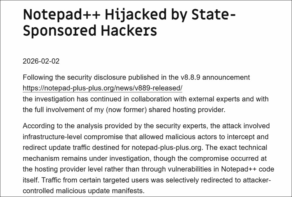 全球最受歡迎的開源文字編輯器之一 Notepad++,其官方更新機制遭到疑似中國國家級駭客組織劫持長達六個月。攻擊者透過入侵託管服務商的基礎設施,將特定用戶的更新流量重新導向至惡意伺服器,讓受害者在不知情的情況下下載了內建後門的安裝程式。Notepad++ 開發者 Don Ho 於 2 月 2 日發表聲明,向所有受影響用戶「深表歉意」,並揭露了這起自 2025 年 6 月至 12 月持續運作的供應鏈攻擊全貌。