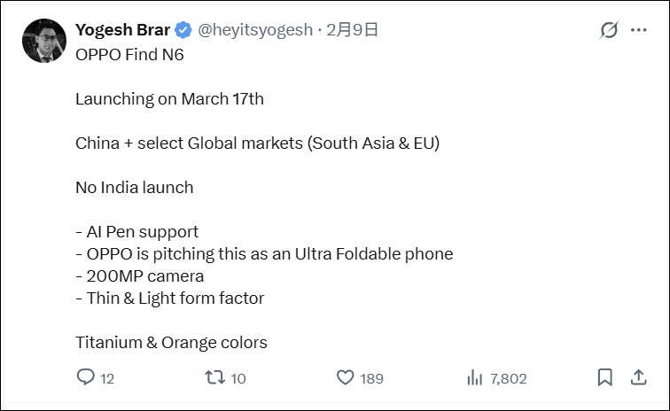 OPPO 新一代摺疊屏旗艦 Find N6 發佈日期正式曝光。根據 X 平台知名爆料人士透露,這款備受期待的大摺疊手機將於 2026 年 3 月 17 日正式發佈,預計登陸中國、南亞及歐盟市場。