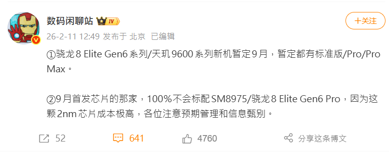 高通今年預計推出兩款旗艦晶片:Snapdragon 8 Elite Gen 6 和 Snapdragon 8 Elite Gen 6 Pro,但根據中國爆料人數碼閒聊站(Digital Chat Station)在微博上透露的消息,每年九月都會首發芯片的那家(小米)最新手機(小米 18 系列)將不會搭載最頂級的 Snapdragon 8 Elite Gen 6 Pro,原因很簡單:太貴了 。