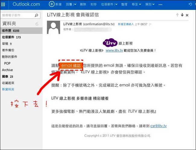 按下通行碼,系統會自動把一串數字發送到手機裡,那就是第一次的登入密碼,同時系統也會把認證信寄到你提供的信箱中,點選裡面的連結就可以再次導到LiTV官網。